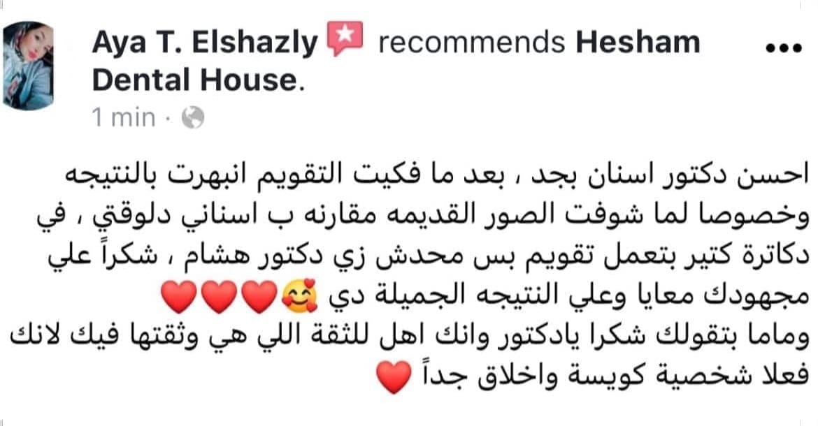 "من أشطر دكاترة الأسنان دكتور محمد هشام، تعبتك معايا طول فترة التقويم لإنك بذلت مجهود كبير معايا عشان النتيجة تطلع مرضية بالنسبالي، شكرا لحضرتك ودايما في نجاح إن شاء الله"